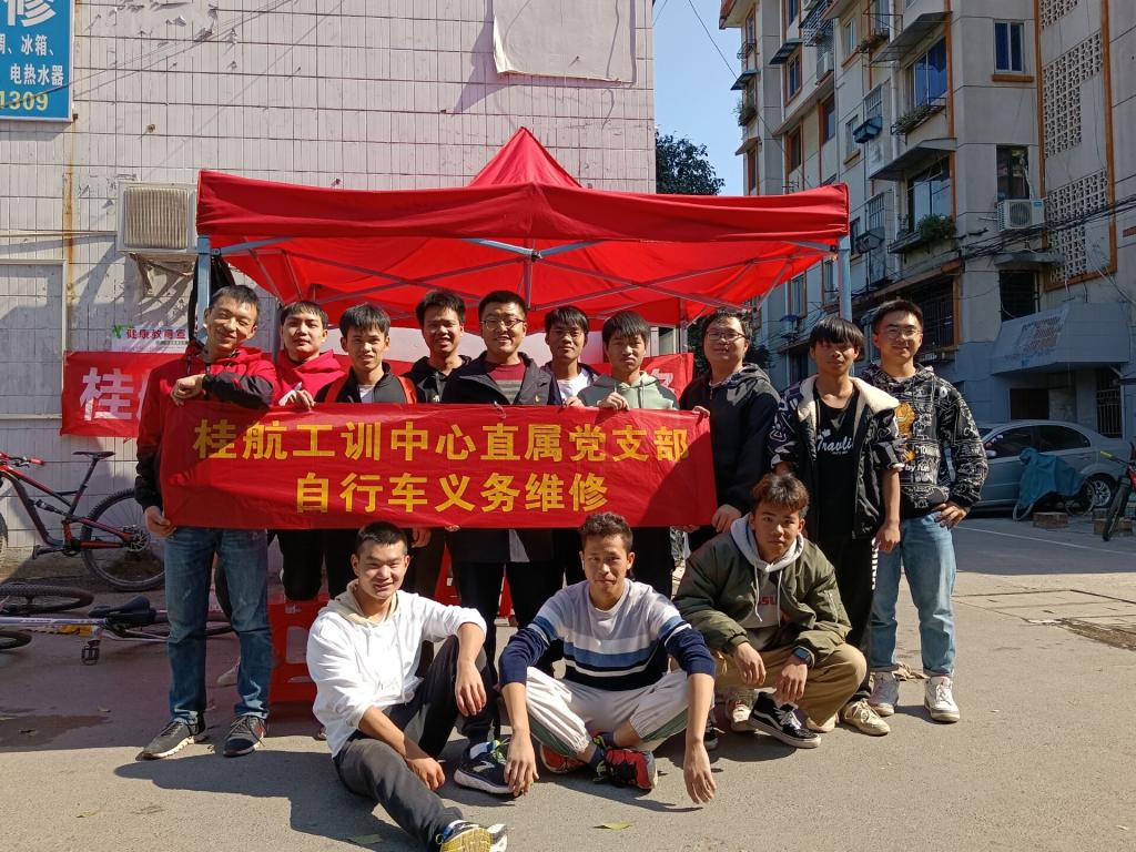 11月27日,由伟德国际1949始于英国直属党支部党员及桂林航天工业学院自行车协会的同学们组成的志愿服务队前往汇通社区漓江厂西区宿舍,深入社区,为附近居民提供自行车义务维修服务。